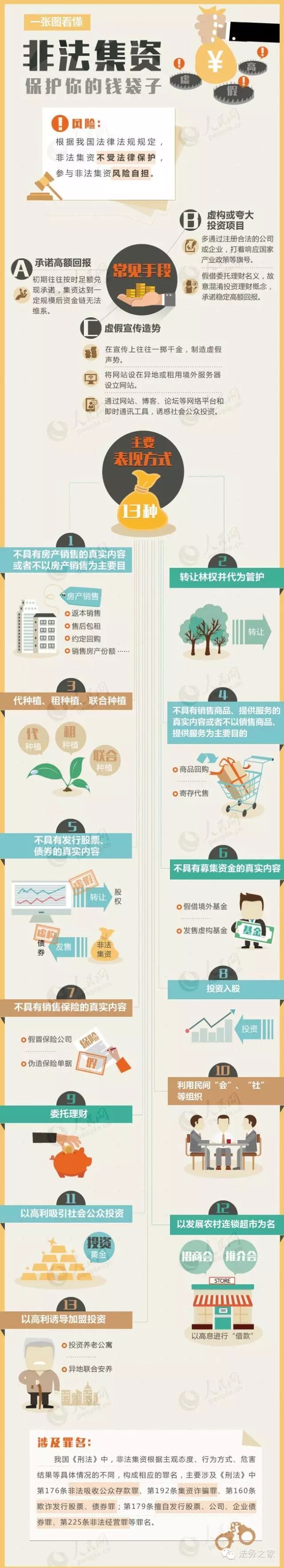 前言:昨晚接到某省市一个素不相识的朋友电话,咨询关于非法集资的事情,小编简单给了解答。对于这位朋友我非常同情,以及这位朋友身边的大部分百姓,有些人可能倾全家之力把钱投入进去,如今不说利息难以兑现,本金都无法要回了,作为法务之家的客服,小编也无能为力,投资有风险,入资需谨慎。而且小编不只一次推送过非法集资的内容,也警告过,“他们看中的是你的本金,你看中的是高息诱惑”,这注定是一场由美梦变噩梦的过程。 上面的有朋友说,按照民间借贷新规24%年利率是合法的,所以投资款约定利息只要不超过24%年利率,国家应该给予保护。这里回答一下,有两种情况: 1、民间借贷新司解第五条:“人民法院立案后,发现民间借贷行为本身涉嫌非法集资犯罪的,应当裁定驳回起诉,并将涉嫌非法集资犯罪的线索、材料移送公安或者检察机关。 公安或者检察机关不予立案,或者立案侦查后撤销案件,或者检察机关作出不起诉决定,或者经人民法院生效判决认定不构成非法集资犯罪,当事人又以同一事实向人民法院提起诉讼的,人民法院应予受理”。 这时候,能把本金全部要回来的概率趋于0,只能依靠祈祷了。 2、也不是说所有涉嫌非法集资案件的钱都要不回来,2015年新的司法解释规定中,借款人涉嫌非法吸收公众存款、集资诈骗或者生效判决认定其有罪,出借人起诉请求担保人承担民事责任的,人民法院应予受理。就是说你这个投资款借给甲了,借款的时候乙提供担保了,如果因甲涉嫌非法集资,那么你可以起诉乙担保责任归还本金、利息等。 说一下,普通民间借贷跟非法集资的区别: 一个人要做生意、买房,向周边亲戚借钱,是一回事;向社会广告宣传某项目赚钱,收了许多人的钱,从规定上来看,是另一回事。 所以,民间借贷古已有之,向亲戚、朋友借款再多,也只是民间借贷,并不是法律意义上的金融活动,不需要央行的批准,也就没“非法集资”一说。但是,一旦通过现代媒体广而告之,个人吸收存款的对象超过30人以上,就可视为非法吸收存款。 我们再来看看非法集资的现状,可谓怵目惊心! 非法集资部际联席会议近日对外公布了2014年非法集资情况,据统计,2014年非法集资案发数量、涉案金额、参与集资人数等大幅上升,同比增长两倍左右,均已达到历年峰值。其中,跨省案件、大案要案数据显著高于2013年水平,跨省案件133起,同比上升133.33%,参与集资人数逾千人的案件145起,同比增长314.28%,涉案金额超亿元的364起,同比增长271.42%。 非法集资涉及行业领域众多,以下领域的风险一定要注意啦 (一)投资理财领域。近两年来,各地出现大量以投资理财咨询为名从事各类金融业务活动的公司,如投资咨询、非融资性担保、第三方理财、财富管理等,常常打着投资理财的旗号,承诺无风险、高收益,公开向社会发售理财产品吸收公众资金,甚至虚构投资项目或借款人,直接进行集资诈骗。据部际联席会议办公室统计,2014年全国新发投资理财类案件1267起,同比上升616%,涉案金额547.93亿元,同比上升451%。此类机构多设在商业闹市区,多选择高档写字楼等,门面豪华,一般有工商登记的合法身份,其名称和业务与金融密切相关,普遍存在超范围经营、虚假宣传、违法违规发售理财产品等情况,对老百姓有很大的欺骗性。 (二)P2P网络借贷。近两年来P2P网络借贷机构数量成倍增长,由于缺乏相应法律定位、政策标准和行业规则,市场主体鱼龙混杂,非法集资案件大量爆发,风险迅速蔓延,2014年P2P网络借贷平台涉嫌非法集资发案数、涉案金额、参与集资人数分别是2013年全年的11倍、16倍和39倍。此类案件有一些是以P2P为名行集资诈骗之实;另有一些则是从传统民间借贷、资金掮客演化而来,以开展P2P业务为噱头,主要从事线下资金中介业务,开展大量不规范的借贷、集资业务,极易碰触非法集资底线。在这里提醒广大投资者,P2P网络借贷属于信息中介机构,只能进行“点对点”、“个人对个人”的交易撮合,不能充当信用中介,投资者签订借款合同的对象不能是平台本身;P2P本质上是向陌生人出借自己的资金,属于较高风险类的投资,需要投资者具备相应的风险意识、投资管理能力和风险承受能力;要警惕“担保”、“保证收益”类的宣传,警惕一些通过论坛、网帖、甚至街头路边、市场集市等线下渠道以“P2P”名义招揽客户的机构组织和人员。 (三)农民专业合作社。部分农民专业合作社突破社员制、封闭性原则,超范围吸收农民资金却未用于农业生产,而是高息放贷赚取息差,资金链断裂、暴力催债、“跑路”事件等频频发生。据部际联席会议办公室统计,2014年,全国新发农民合作社非法集资案件61起,涉案金额18.01亿元,参与集资人数12571人,同比分别上升177.27%、998%、224.32%。此类案件主要涉及河北、江苏、辽宁、河南、山西、山东等地,个别地方已经出现行业性风险。一些农民专业合作社或由原先开办担保公司、投资公司的经营者发起设立,或以合法身份为幌子,仿照银行外观设立营业网点,通过代办员、业务员广泛吸收农民存款,欺骗性极强,严重损害了农民利益,影响农村金融秩序和社会稳定。 (四)其他领域。房地产、建筑领域非法集资案件几乎遍布全国所有省份,多年来持续高位运行。这类案件比较易受宏观调控政策影响,在经济下行预期较强、去库存压力较大的情况下,以高息借贷维持资金